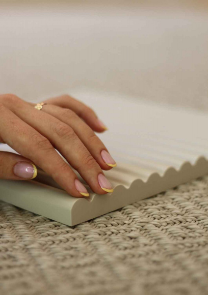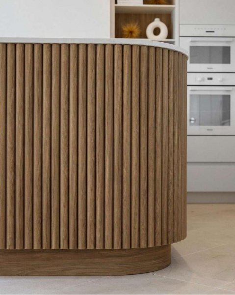 É justamente essa combinação entre técnica e delicadeza que confere ao ripado boleado seu caráter sofisticado. Cada peça carrega um controle preciso de execução, resultando em um painel onde a transição entre luz, forma e material acontece de maneira fluida.