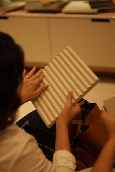 Essa mudança, aparentemente sutil, transforma completamente a percepção do painel. A luz passa a deslizar pelas superfícies de forma suave, as sombras tornam-se mais delicadas e o conjunto ganha uma estética mais sofisticada.